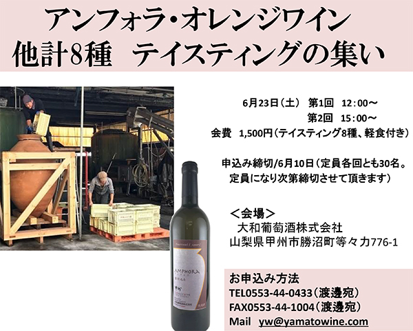 大和葡萄酒では、昨年から導入した「アンフォラ」(醸造用の素焼きの壺)を使用したワインのリリースを記念して、テイスティングの集いを開催いたします。 6月23日(土)12:00〜 会費 1,500円(テイスティング8種、軽食付き) 定員30名。定員になり次第締切させて頂きます
